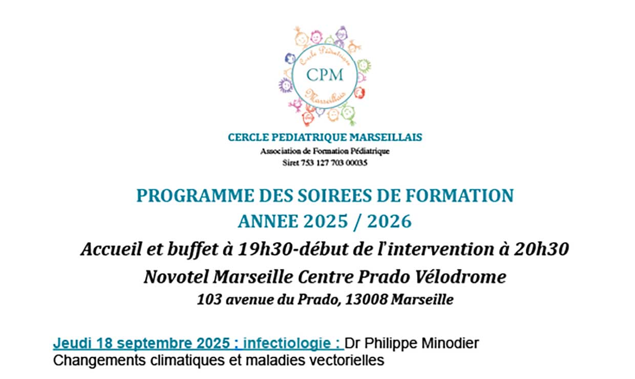 L’adhésion vous permettra d’assister aux 5 réunions annuelles de formation du Cercle Pédiatrique Marseillais qui se dérouleront au Novotel Prado à Marseille. Vous serez accueillis dès 19 h30 autour d’un buffet, puis l’intervention se déroulera de 20h30 à 22h.